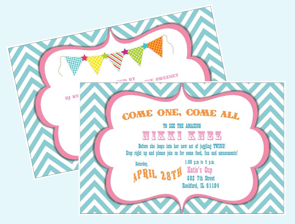 As you can see by my blog design, I love, love, love chevrons and I have been wanting to do a party where I can incorporate them in a design. I was so excited when I was asked to design some invitations for a carnival/circus themed baby shower that included chevrons! Here is a peek at the invitation….