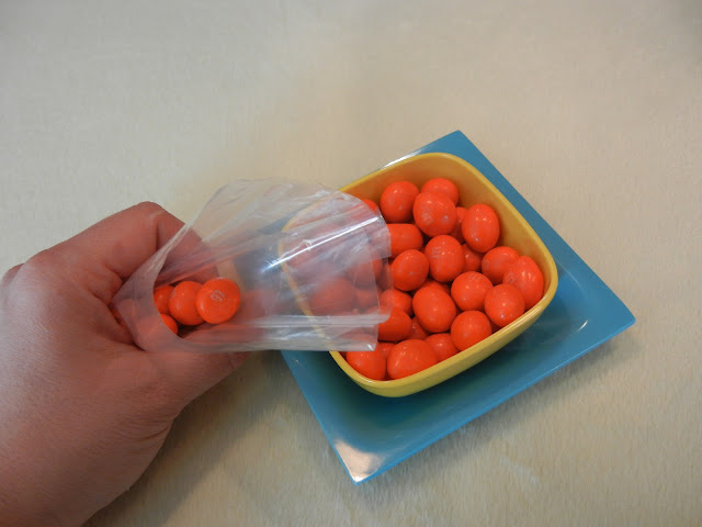 Open bag and fill with treats (be sure to fill the original bag not the part you folded)