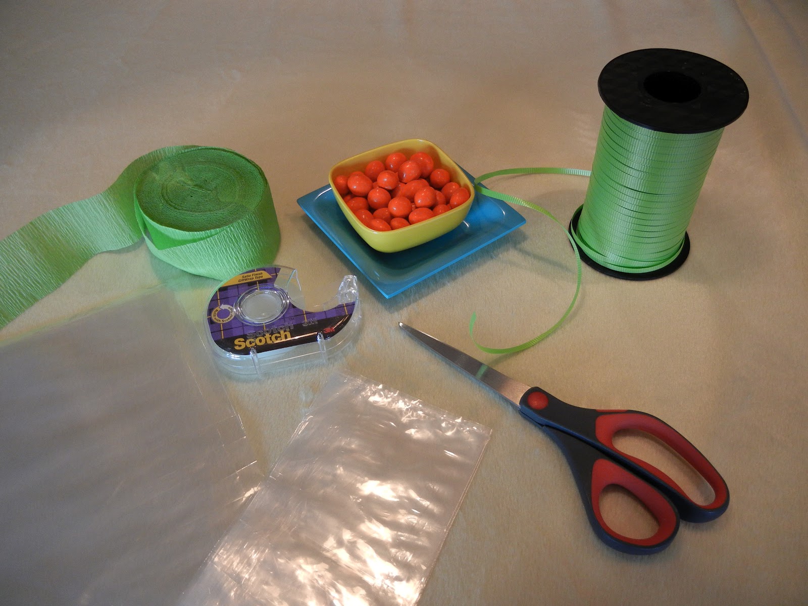 You probably have seen those adorable cone shaped treat bags filled with treats to look like carrots. I noticed some the other day filled with orange cotton candy and thought they would be perfect for our upcoming Easter party. You can purchase the cone bags at almost any craft store or even use the icing bags. This tutorial will show you how to make them with a bag you probably already have in your party arsenal.