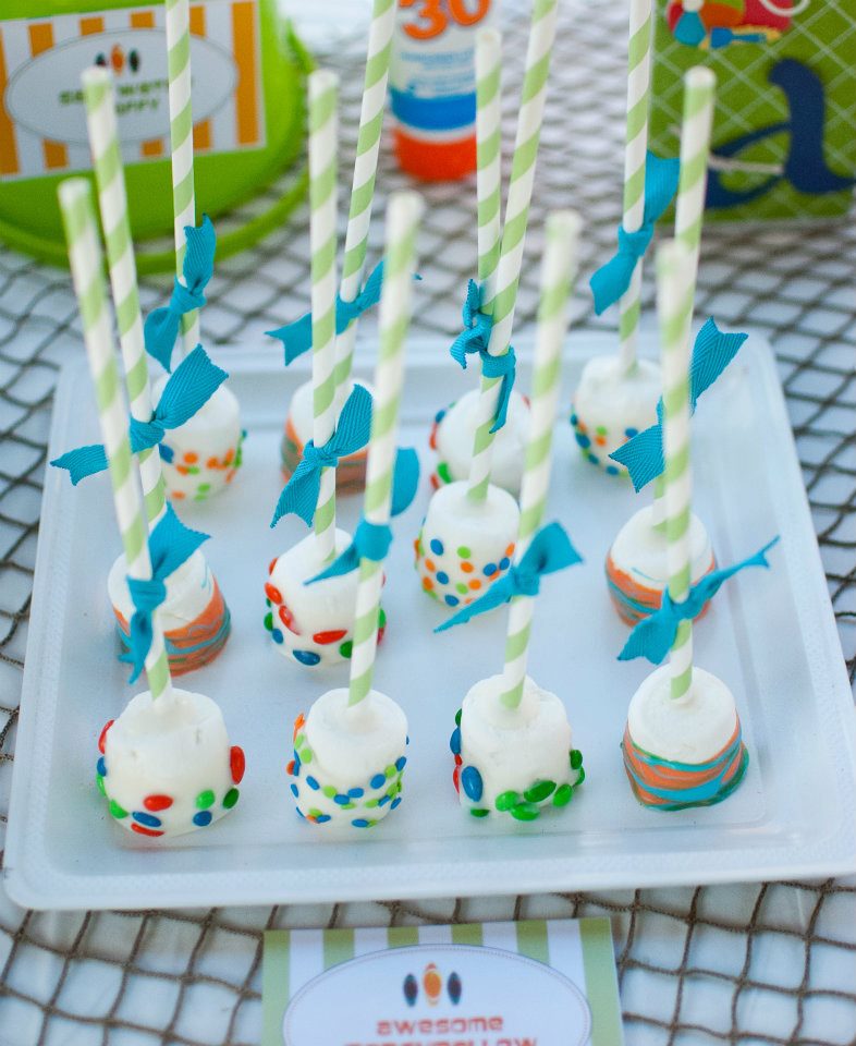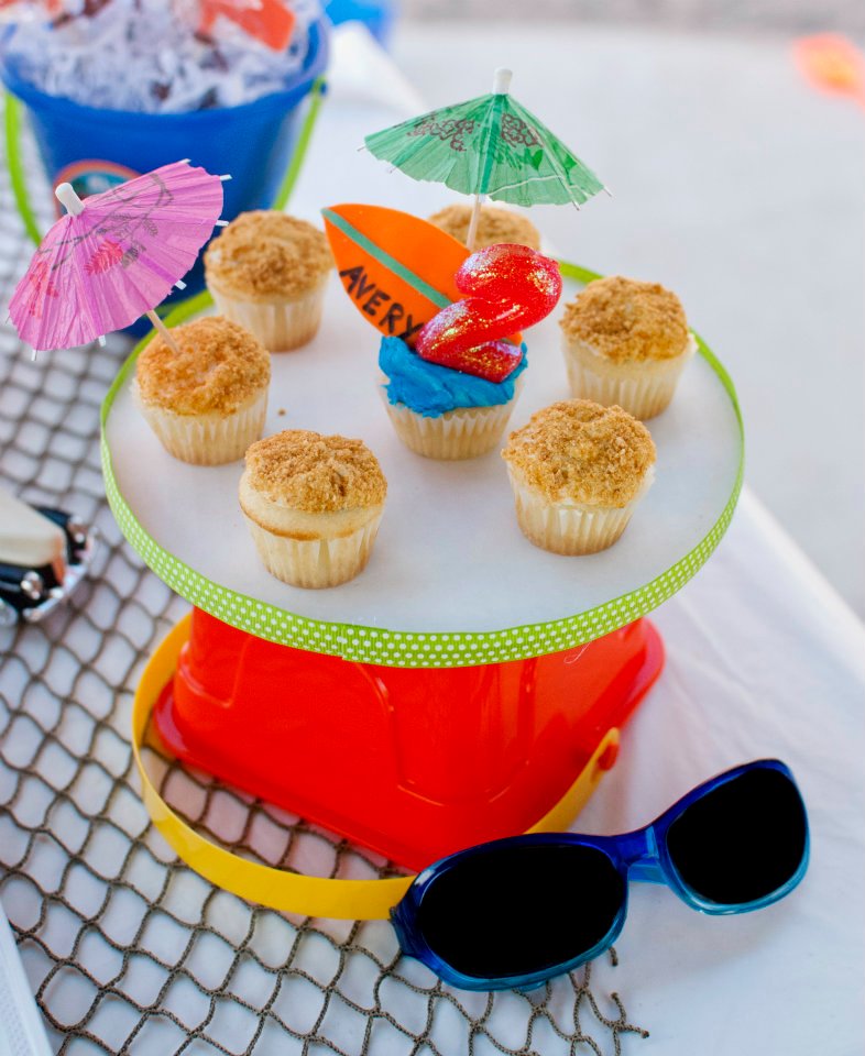 I knew I wanted boy colors and I knew I wanted them to be bright, so Orange, Lime Green and Bright Blue seemed like a natural place to start. I themed the entire party around those 3 colors. I also loved the idea of re-purposing sand pails, and using them as containers for both the dessert table and the food tables. After that it all fell into place. Stephanie of Suckersbysteph was amazing to work with, she provided the Chocolate #2 pops, the round pop favors, and the printables. My friend Maria Sauerbrei did all the photography, and Michelle (from Party Plan-It) designed our fun welcome sign. I created the surf’s up banner, the name blocks, the cupcake stands and styled the table through Picture Perfect Party Designs. The marshmallow pops, cookies, cupcakes and all other goodies were through my cupcake boutique Buttercream Bling.