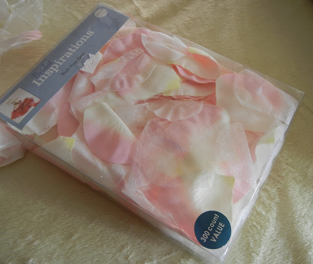 I’ve had these flower petals in my craft stash for a long time, I don’t remember why I bought them but I finally put them to use at our Easter Party. I found them in the wedding isle at Joann’s Fabric Store. This particular pack also has tulle petals which I love for this project.