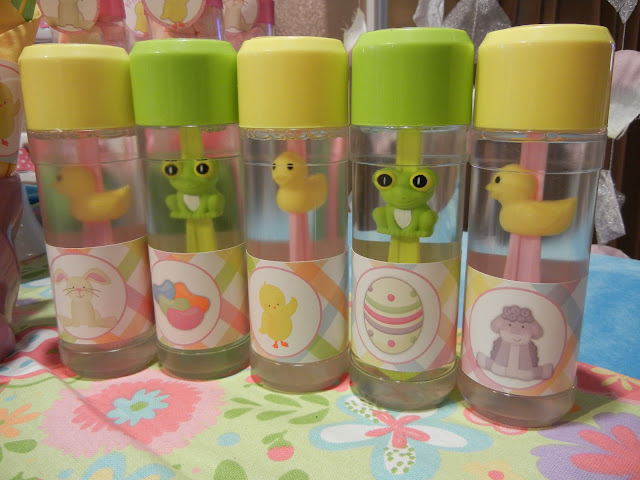 Use them to wrap bubbles as party favors. I found these adorable duck and frog bubbles at the Dollar Tree, aren’t they cute? They would be great for a first birthday party too!